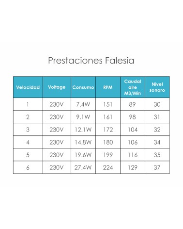El ventilador de techo FALESIA tiene una potencia de 40 vatios y un voltaje de 220 – 240 voltios.